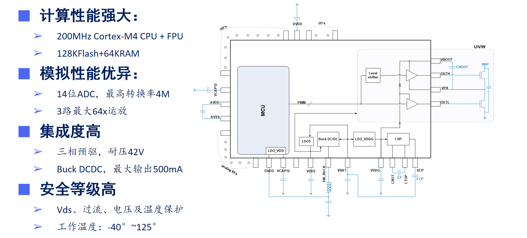在这款方案中,SPD1148芯片提供了强力支持,是旋智科技针对12/24V低压应用所推出的高算力、高集成度SOC。其内部集成了一颗200MHz的Cortex M4F核心处理器,带有最大64kB RAM及128kB Flash,具有同类产品中最强大的计算性能,同时带有采样率达到4MHz的14位ADC,芯片内置6路N-Mos的驱动,最大耐压42V。