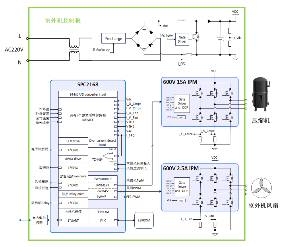 ·该芯片非常适合HVAC全变频空调、热泵外机应用,可实现高达80kHz的PFC环路计算控制和室外机双电机FOC矢量控制,例如在我们的产品设计中,单一SPC2168芯片的一个内核处理器可同时驱动一个400Hz电转速的直流变频压缩机以及一个200Hz电转速的直流变频外风机,另一个内核控制高频PFC电路。